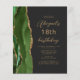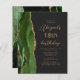 A borda esquerda deste elegante convite de aniversário moderno apresenta um caçador de aquarela verde agata borda com brilho dourado. O texto personalizável combina o script dourado e as fontes sans serif em um fundo preto de slate. O verso apresenta um design verde e dourado correspondente.