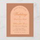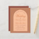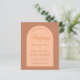 Um convite de casamento com design moderno e várias tonalidades de marrom. Ele tem um arco marrom-claro contendo texto. A palavra Casamento e os nomes são escritos em caligrafia laranja elegante, a primeira linha é um texto curvo.