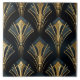 Este azulejo cerâmico apresenta um padrão sem costura Art Deco gold com um padrão estilizado de ouro e preto no fundo. Os arranjos simétricos e o esquema de cores do marinho escuro e do ciano claro criam uma experiência visual cativante. O design, criado por um ilustrador arquitetônico, é ininterrupto e reproduzível, fazer uma opção versátil para vários espaços.
