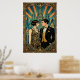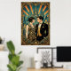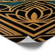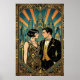 Transport yourself to the roaring twenties with this elegant Art Deco portrait of a sophisticated couple. Featuring a flapper girl in a geometric beaded dress and a man in a sharp tuxedo, they are framed against a stunning stylized city skyline bathed in golden hour light. With a rich teal and gold color palette and opulent geometric borders, this piece captures the peak of Jazz Age romance and luxury. Perfect for a dining room, living area, or a vintage-themed wedding gift.