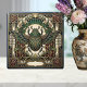Embrace the elegance of the Art Deco era with this stunning ceramic tile featuring a majestic scarab beetle. Intricately detailed with swirling patterns and rich green and gold hues, the scarab is framed by delicate floral motifs and lush foliage. The design evokes a sense of ancient mystique and sophisticated style, perfect for adding a unique touch to any space. Whether used as a statement piece or part of a larger mosaic, this tile brings a touch of timeless artistry and natural beauty into your home decor. The detailed craftsmanship and striking color palette make it a captivating addition to any collection.