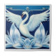 Um cisne branco espalha suas asas sobre lírios deco de arte em um lindo fundo azul.