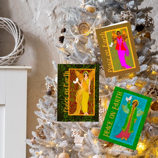 Personalize este cartão com a sua própria saudação! Nouveau de Arte Nostálgica e estilos de Artes e Artesanatos se fundem nesses novos designs para se tornarem um novo e colorido design moderno/retrô. Um anjo estilo Barbier com asas de ouro segura uma pomba branca sobre um fundo de padrões de papel de parede e tecido William Morris. O guião Paz na Terra corre ao lado. Este cartão pode ser adquirido como está ou personalizado com sua própria mensagem e nome.