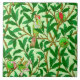 Azulejo em um padrão de tapeçaria de aves exóticas em uma árvore romã, com folhas verdes esmeraldas, pássaros e frutas em vermelho verde limão e rubi profundo, e um fundo verde limão pastel
