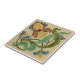 Observe que, embora pareça que esse azulejo é dimensional como o azulejo original moldado, essa reprodução é na verdade plana, impressa em um alivio falso ou estilo trompe l'oeil ("engane o olho") que captura o aspecto do relevo detalhado no original em um azulejo cerâmico liso.