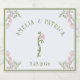 Vinho espumante de casamentos com motins florais art nouveau, nomes de casais e data de casamento em formato verde sobre fundo branco com tons azuis