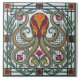 This stunning ceramic tile features a captivating Art Nouveau-inspired design, showcasing a vibrant octopus at its center. The octopus is rendered in rich hues of orange, burgundy, and yellow, with flowing tentacles intertwined with lush green foliage and delicate pink and yellow floral accents. The intricate details and bold color palette evoke a sense of classic elegance, reminiscent of early 20th-century decorative arts. Perfect for adding a touch of vintage charm and artistic flair to any space, this tile is a true statement piece.