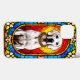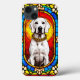 Representação vívida de um cão branco adornado com um colar de ouro retratado em arte de vitral impressionante, mostrando cores vibrantes e elementos de design intrincados.
