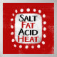 "Calor ácida com Gordura de Sal" é um design de texto divertido com forma de sotaque branca rodeado por pontos texturizados brancos.