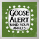 Um design de animais tipográficos irreverentemente estranho que diz "Alerta de Ganso, Mente Seus Ankles". Ele apresenta texto preto e vermelho em um retângulo branco com pontos brancos engraçados e brincalhões ao redor dele, tudo em um fundo de cinza.