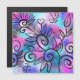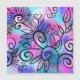 Um passarinho engraçado no canto superior esquerdo e elementos florais num fundo rosa, roxo e turquesa.