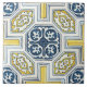 Um padrão de arte geométrica de azulejos com flores e folhas em azul, branco e amarelo, com um olhar pintado à mão.