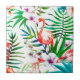 Trabalho de arte de tema tropical de um flamingo cor-de-rosa e plantas tropicais verdes com flores e palmas de hibisco contra fundo branco neutro. Uma peça de arte divertida e colorida.