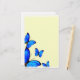 Artigos de papelaria bonito feitos com um fundo amarelo pálido e umas borboletas azuis brilhantes bonitas no canto da parte inferior esquerda. Vista muito elegante e à moda. Grande papel de carta pessoal para algum dia.