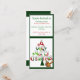 Uma árvore de Natal vermelha, branca e verde, muito feliz com um pássaro num chapéu de Papai Noel olhando.