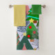 Este conjunto de toalhas tem um pano de lavagem verde, uma toalha de ouro e uma toalha de banho com um design de árvores de Natal em vários tons de verde, rosa, prata e ouro com diferentes decorações.
