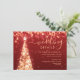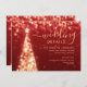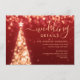Modelo de cartão de detalhes/informações de casamento de Natal elegante e festivo Árvore de Natal Dourado Vermelho, apresentando endereço da festa e instruções, luzes cintilantes da Árvore de Natal e tipografia moderna em script.