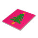 Ilustração de uma árvore de Natal verde brilhante. Uma estrela dourada fica no topo e a árvore está vestida com decorações cor-de-rosa, azuis e laranja.