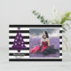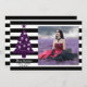 Esta árvore de natal gótica com riscas apresenta um lugar para sua foto favorita, uma árvore de Natal roxa com crânios contra um fundo de listras preto e branco. Personalize com seu nome e ano na frente com mais espaço no verso para sua mensagem de feriado.
