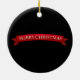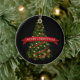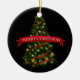 Enfeites de natal apresentado em forma redonda, de porcelana, de fundo preto e impressão de árvore festiva. Personalize este item ou comprar como está.