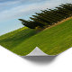 Poster de um grupo de ciprestes numa paisagem com colinas verdes e flores amarelas sob lindas nuvens brancas perto de Torrenieri, no Vale de Orcia, na Toscana, Itália.
