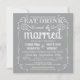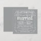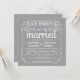 Coma, beba, e é casado -- Convites rústicos elegantes do casamento do país do estilo -- Swirly, rolos encaracolado e tipografia do vintage da velho-forma na rotulação branca no fundo de prata do cinza da pérola. Adicione os nomes dos noivos e a informação wedding neste modelo fácil de usar. O rico, o divertimento e a caligrafia escrita à mão lunática, retro do estilo do giz podem ser alterados para seu tema formal ou semi-formal do casamento. O estilo moderno ocasional mas elegante é perfeito para casamentos contemporâneos na moda com um toque do encanto sofisticado romântico para casais tradicionais. Contacte-nos por favor para a ajuda com personalização se você precisa a sala adicional para seus detalhes do casamento. NOTA: Mostrado em cartões padrão do convite do tamanho A7. Outros tamanhos e estilos disponíveis, junto com selos postais de harmonização, artigos de papelaria nupciais de coordenação, acessórios wedding do pacote e favores do chá.