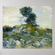 As Rochas. Vincent van Gogh. Paisagem em tons verdes-azuis frios. Há pedras no primeiro plano. No meio há um monte com uma árvore e pedras. O céu está nublado. Reprodução de famosas imagens de arte no dominio público.