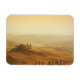 Fotografia retangular de um nascer do sol sobre a famosa vila Podere il Belvedere, numa paisagem com colinas estéreis e rolantes no Val d'Orcia, na Toscana, Itália.