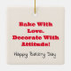 Este é um ornamento muito divertido para qualquer um que ama assar, mas especialmente decorar. A frente apresenta um padeiro que é fazer bolo de chocolate e joga esses aspersores por aí! As costas têm pequenos corações ouros atados. Na parte de trás, lê-se: "Assar Com Amor. Decorar Com Atitude!" Seguidamente, o "Feliz Dia da Padaria", que é anual na quarta sexta-feira, em setembro. Você pode alterar ou remover todo o texto na parte traseira e colocar o que quiser (ou seja, NOME, ANO) para se adequar ao seu destinatário. Desenhado por Sheila Cicchi, Brownielocks.com. Todos os Direitos Reservados. NOTA: devido ao estilo design, isso só pode ser para ornamentos SQUARE.