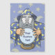 Um velho feiticeiro com capa azul olhando para a bola mágica de cristal.