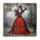 Renderização digital em 3D de um belo feiticeiro feminino em um vestido vermelho e preto com asas em um fundo de castelo fantasticamente assustador