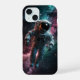 Astronauta flutuando sozinho no espaço com fundo de galáxia rosa.