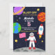 É hora de explodir e celebrar seu aniversário! Um astronauta na lua no espaço sideral rodeado por planetas, foguetes e estrelas em cores brilhantes e divertidas para qualquer idade. Sinalizador rosa para realçar a idade ou talvez o nome.
