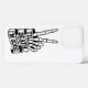 Uma ilustração ousada e ousada de uma mão esquelética formando um sinal de paz, embrulhada numa fita vintage que diz "ATÉ A MORTE, EU SOU BOM." Esta trabalho de arte monocromática transmite uma mensagem rebelde, mas calma, misturando a estética gótica com uma atitude legal e retardada.