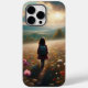 A trabalho de arte retrata uma jovem caminhando por um vasto campo colorido de flores, esticando-se em direção a montanhas distantes. Ela está vestindo uma mochila e uma casaco, o que sugere um senso de aventura e exploração. O céu é dramático com uma mistura de nuvens e luz do sol, lançando um ouro brilhando sobre a paisagem. Árvores à distância adicionam profundidade à cena, enquanto o caminho em que ela caminha é banhado na luz quente e suave do amanhecer ou do anoitecer.