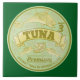 Uma ilustração do estilo pop da tampa de uma lata de atum. Este é desenhado em vetor e tem a aparência de um poster de publicidade retrógrada. Tem atum e é desenhado em tempos de verde e amarelo. Um design para qualquer um que ama peixe enlatado/conservado.