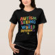 A imagem apresenta um design vibrante e colorido com o texto: "AUTISM SEEING THE WORLD DIFERENTLY" Cada palavra está em letras negrito, multicolorido (vermelho, amarelo, verde, azul, roxo). O "O" no "MUNDO" é representado por um símbolo de quebra-cabeça em quatro cores (vermelho, amarelo, verde, azul), que é uma representação comum da consciência do autismo. Abaixo do texto está uma pequena quebra-cabeça em amarelo, simbolizando a inclusão e a compreensão. O design é definido contra um fundo preto, fazer as cores pop