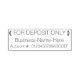 Este design de carimbo de classe apresenta a mensagem "SOMENTE PARA DEPÓSITO", juntamente com um nome pessoal/comercial personalizado e um número de conta. Pode ser utilizado por um funcionário de escritório, um funcionário financeiro ou um contabilista para acrescentar facilmente um averbamento restritivo a um cheque.