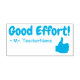 Este encorajador design de carimbo mostra a mensagem inspiradora "Bom Esforço!" e o nome de um educador personalizado. Ele também apresenta um ícone de thumbs-up decorativo. Poderia ser usado por um professor ou educador ao marcar missões, para reconhecer que o aluno fez bem.