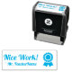 Este inspirador design de carimbo apresenta a mensagem de feedback motivacional "Nice Work!" e o nome de um tutor personalizado. Ele também apresenta um ícone decorativo de fita de prêmio. Ele poderia ser usado por um professor, educador ou orientador ao marcar trabalhos, para indicar que um aluno fez bem.