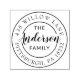 Carimbo de endereço de retorno com nome de família no script de caligrafia manual moderno rodeado pelo seu endereço de retorno