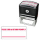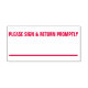Este design de selo de borracha de autoimpressão apresenta a solicitação "POR FAVOR, SIGN & RETURN PROMPTLY", junto com uma linha sólida abaixo dela. Poderia ser usado por um professor, por exemplo, para pedir que um pai ou um tutor visse a marca que uma criança recebeu em uma tarefa.