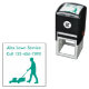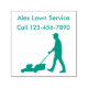 Aqui está um selo de autocolante do serviço de relva comercial com um técnico de cortador de relva em ação e modelos de texto mostrando o nome da sua empresa e o número de contato. Carimbo de faturas de clientes ou correspondência comercial.