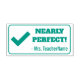 Este design de carimbo motivador apresenta a mensagem motivadora "QUASE PERFEITO!" e o nome de um professor ou educador personalizado. Também apresenta uma marca de verificação decorativa. Ele poderia ser usado por um professor, educador, instrutor ou tutor ao marcar tarefas, para indicar que o aluno fez um trabalho de excelente.