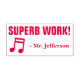 Este design de carimbo motivador apresenta a mensagem "SUPERB WORK!" e o nome de um educador personalizado. Também apresenta uma nota musical decorativa. Poderia ser usado por um professor ou educador ao marcar missões, para reconhecer que o aluno fez bem.
