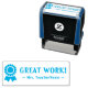 Este design de carimbo positivo apresenta a inspiradora mensagem "EXCELENTE WORK!" e o nome de um educador personalizado. Ele também apresenta um ícone decorativo de fita de prêmio. Pode ser usado por um professor ou educador ao formando o trabalho estudantil, para reconhecer que um aluno fez um trabalho excepcional.