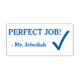 Este design de carimbo motivador apresenta a mensagem motivadora "PERFECT JOB!" e o nome de um educador personalizado. Também apresenta uma marca de verificação decorativa. Poderia ser usado por um professor ou educador ao marcar missões, para reconhecer que o aluno fez bem.