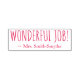 Este design de carimbo motivador apresenta a mensagem motivadora "EMPREGO MARAVILHOSO!" e o nome de um professor ou educador personalizado. Também apresenta uma marca de verificação decorativa. Ele poderia ser usado por um professor, educador, instrutor ou orientador ao marcar tarefas, para indicar que o aluno fez bem.