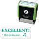 Este design de carimbo inspiracional mostra a mensagem motivacional "EXCELENTE!" e o nome de um professor personalizado. Ele também apresenta uma decorativa enquadrada em oitavas notas. Ele poderia ser usado por um professor, educador, ou tutor ao marcar tarefas, para reconhecer que o aluno fez um trabalho de excelente.