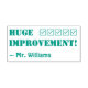 Este design de carimbo encorajador apresenta a mensagem motivadora de feedback "ENORME MELHORAMENTO!" e um nome de tutor personalizado. Ele também apresenta ícones decorativos de marca de seleção. Ele poderia ser usado por um professor, educador, ou tutor ao marcar tarefas, para reconhecer que um aluno fez bem.